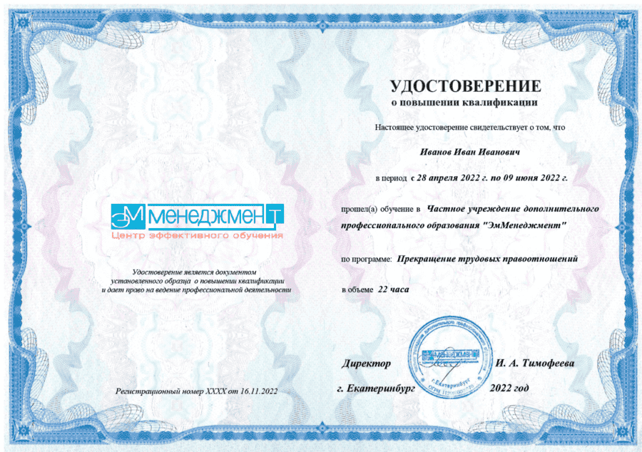 После завершения обучения на курсе по увольнению сотрудников в Центре эффективного обучения ЭмМенеджмент в Магадане выдается удостоверение. Наличие лицензии, выданной Министерством образования РФ, дает право на ведение деятельности, и выдачу законных документов.